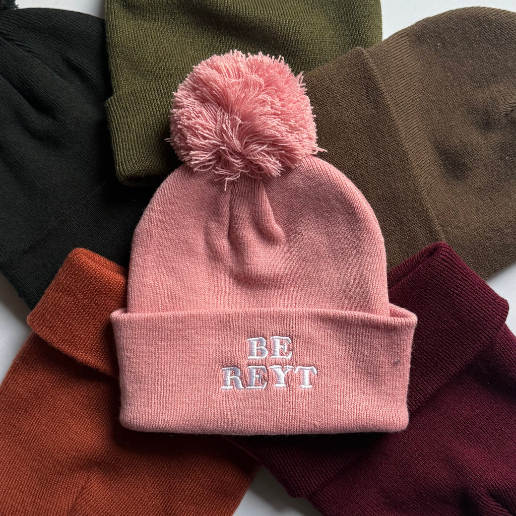 SEO keywords: Be Reyt beanie, embroidered beanie UK, Yorkshire beanie hat, positive slogan beanie, cosy winter hat, UK small business accessories.